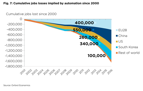 El estudio How Robots Change the World, confeccionado por Oxford Economics, vuelve a demostrar la relación directa entre roborización y desempleo, que se cifra en casi dos personas que pierden su empleo por cada robot que entra en la industria manufacturera. Estas conclusiones son coherentes y van en la misma línea de estudios anteriores (Bruegel, Acemoglu y Restrepo).